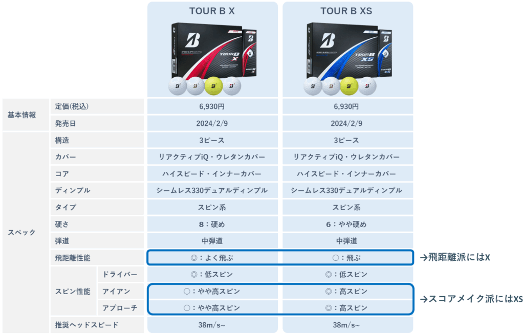 TOUR B Xは飛距離性能を重視したモデルで、強弾道と風に負けない直進性が魅力です。一方、TOUR B XSは柔らかい打感と高いスピン性能を備え、グリーン周りでの繊細なコントロールに優れています。