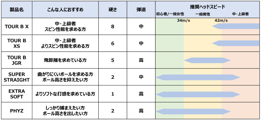 | 商品 | 画像 | 定価 | タイプ | 硬さ | 推奨HS | 構造 | 弾道 | 特長 |
